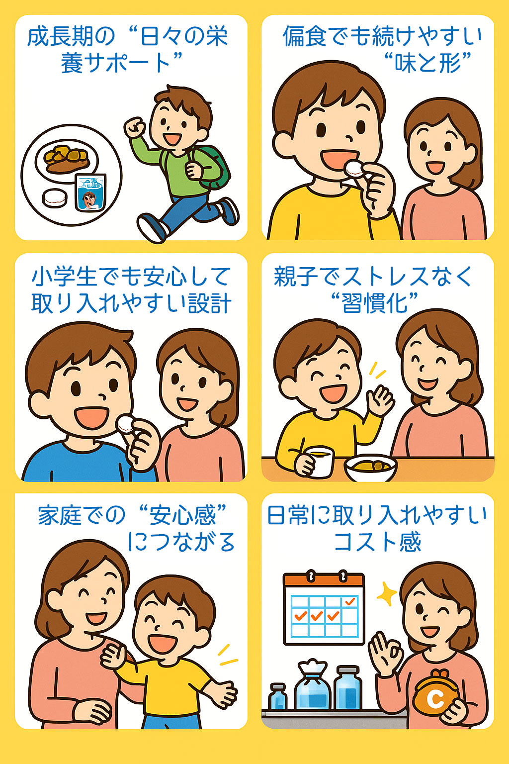 「サプリは嫌がるのでは?」という不安を持つ保護者でも、おやつ感覚で続けてもらえる手軽さを実感しやすいのが大きな魅力です。